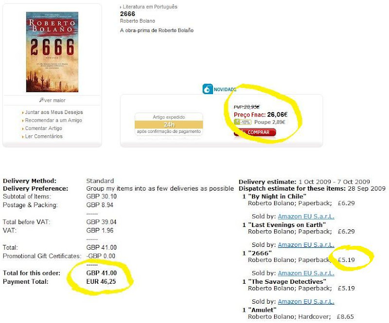 Disposto a sucumbir a bolañomania, fui comparar preços: os números são eloquentes. Por mais 20 euros do que gastaria com a edição portuguesa, fiquei com cinco livros que lerei oportunamente, e que me fornecerão uma visão mais ampla, decerto, da obra de Bolaño. Desculpem a falta de patriotismo.
